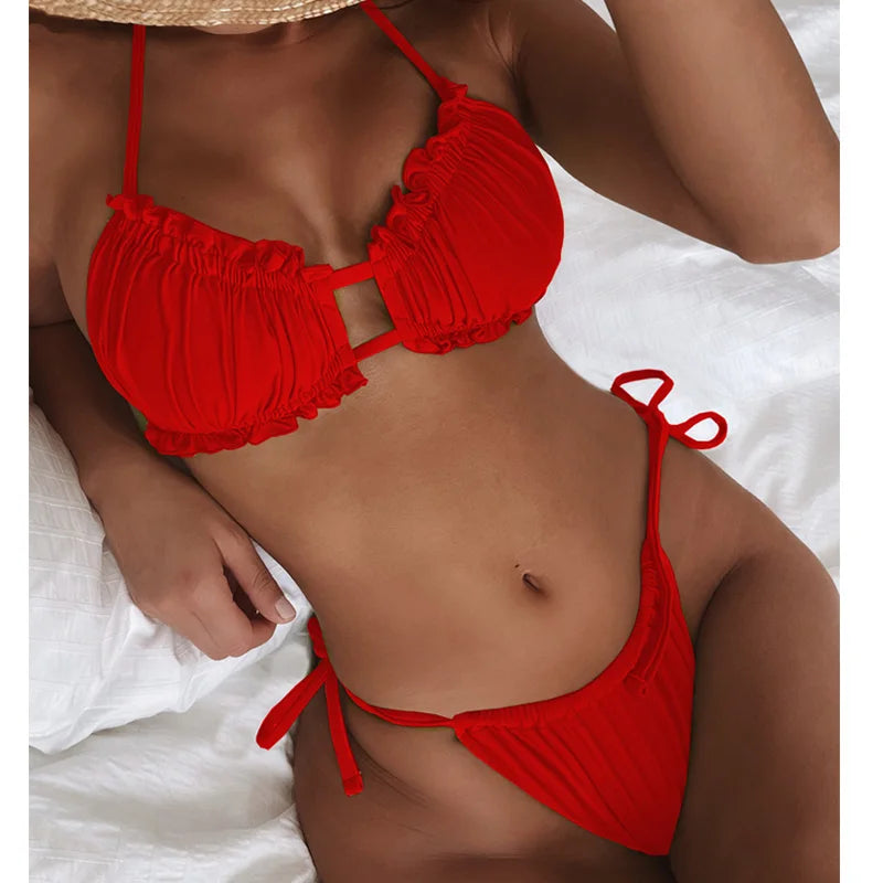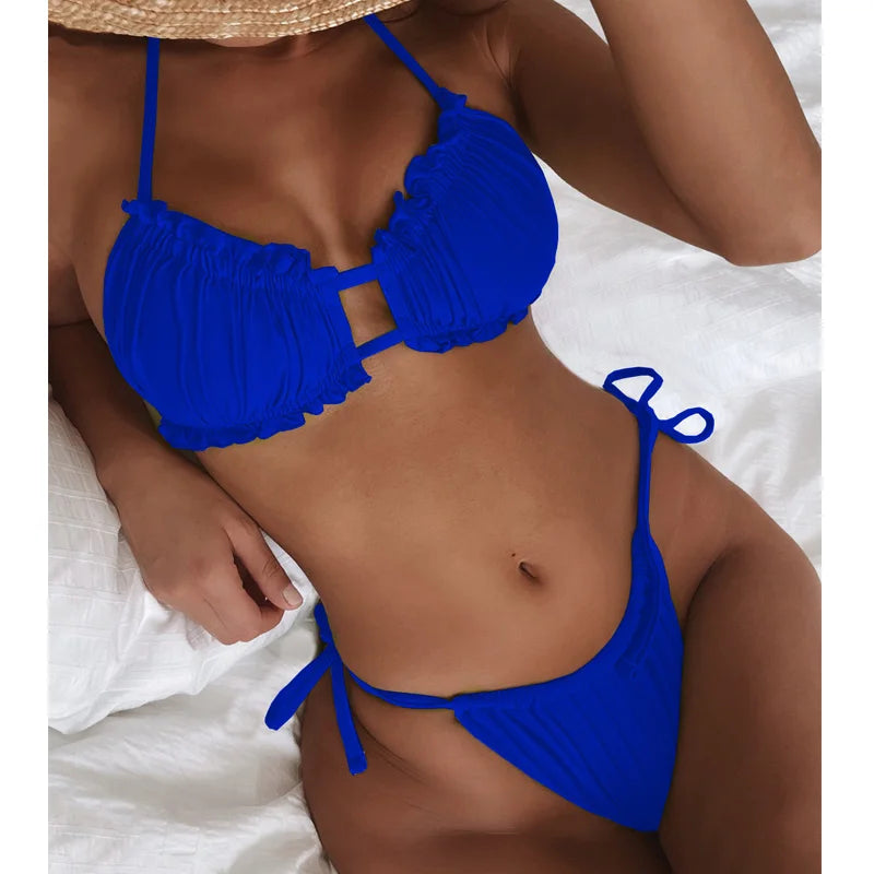 Elevate your swimwear collection with the KEKOKINIS BILIOSHE Vigorashely Tied Halter Bikini. This Brazilian-style set features a solid color design and a high-cut silhouette that flatters every curve. The bandage details and push-up feature add a chic, sexy touch, perfect for your next beach getaway.
