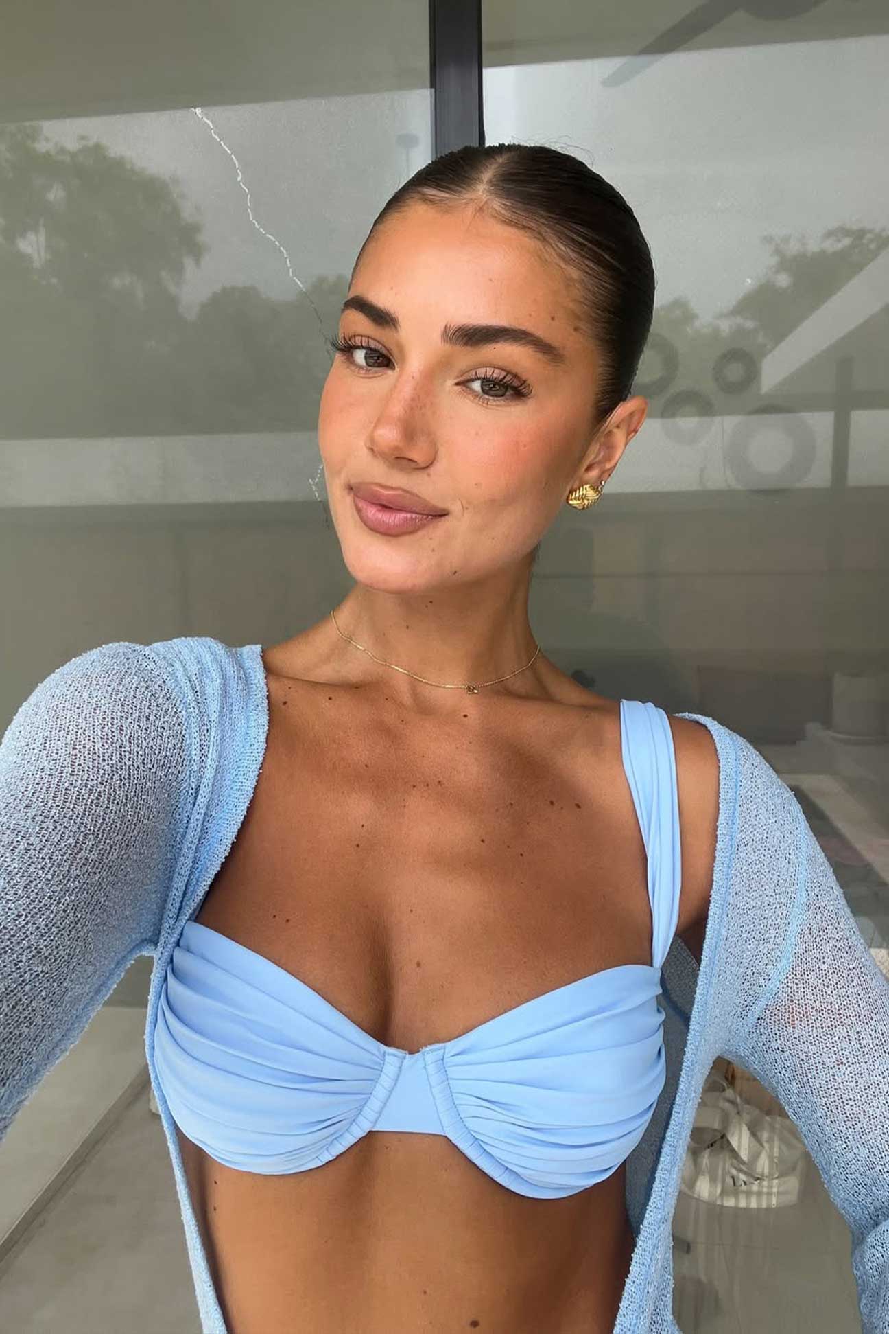 The KEKOKINIS LUCINDA BIKINI in Alora is crafted from certified sustainable ECONYL® fabric, redefining elegance with eco-conscious design. Featuring pleated detailing along the cups and wide adjustable straps, this bikini top ensures a customizable fit that balances support and comfort for all-day wear.