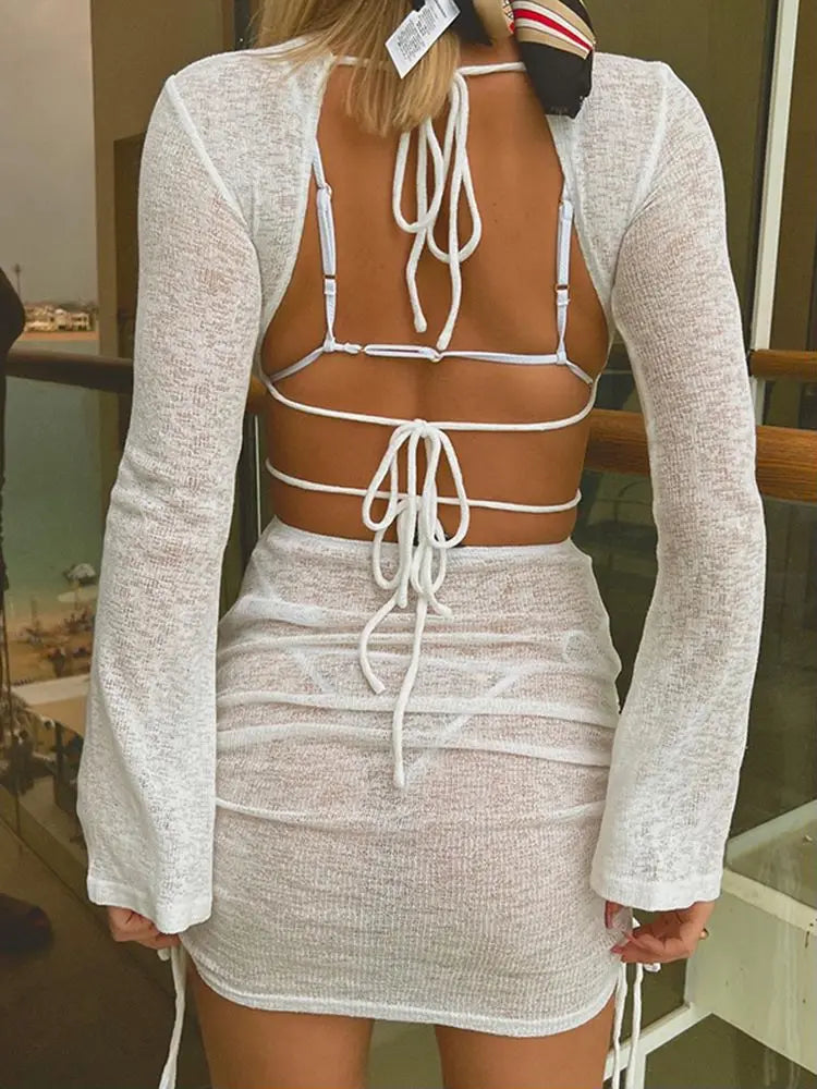Strappy Tie Back Cutout Sheer Knit Bell Sleeve Cover Up