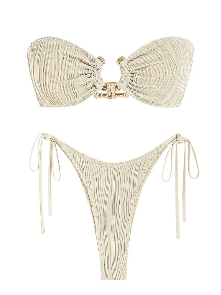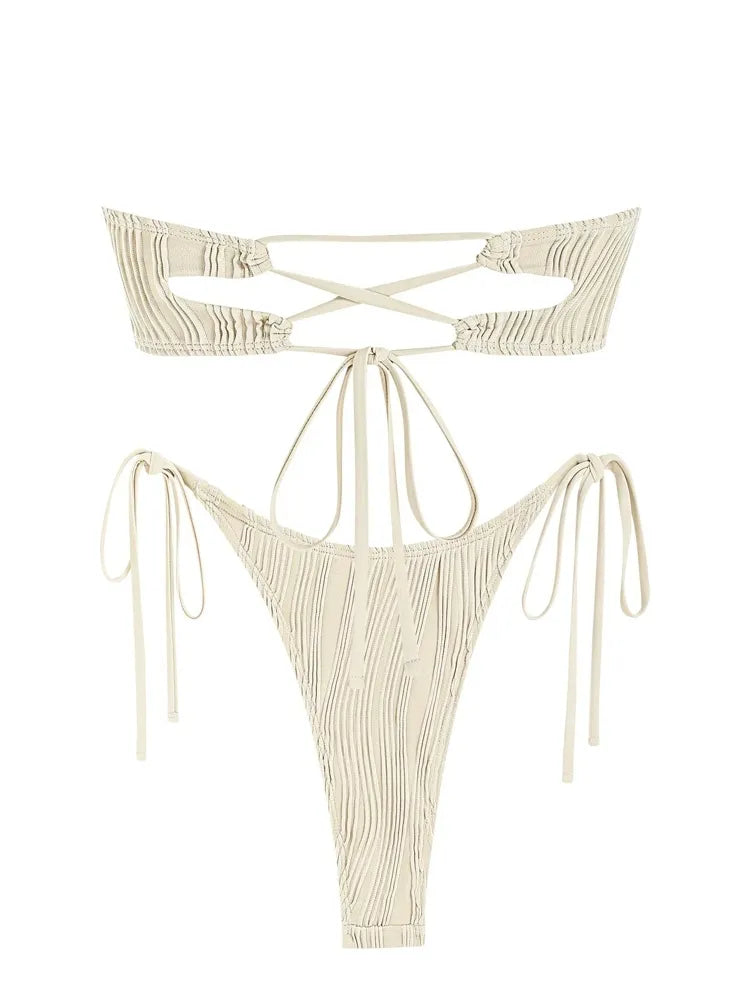 Elevate your swimwear game with the KEKOKINIS SPLICINA BIKINI SET, a bold and sexy two-piece designed to turn heads. Featuring a strapless bandeau top with removable padding for customizable support and a tie-side tanga bottom with flattering low-waist fit, this set blends elegance with comfort. The metal O-ring details, crisscross lace-up back, and fishnet accents add edgy sophistication, while the high-stretch polyester-spandex fabric ensures a perfect fit and freedom of movement for any beach or pool activity.