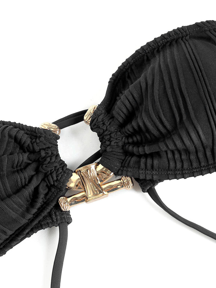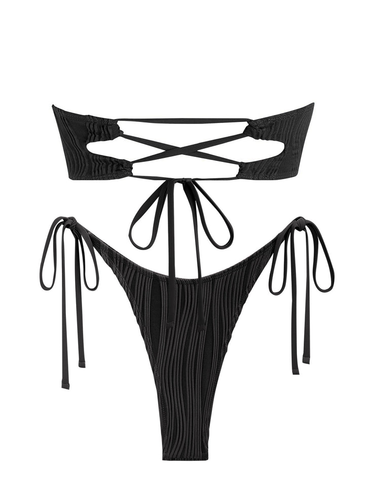 Step out in style with the KEKOKINIS STYGIAN Tie Side Bandeau Tanga Bikini Set. This two-piece swimsuit features a strapless padded bandeau top with lace-up back detailing for a customizable fit. The tie-side tanga bottoms offer a flattering low waist silhouette, complemented by metal embellishments and crisscross accents for added edge. Crafted from a high-stretch blend of polyester and spandex, it promises comfort and flexibility with every move.